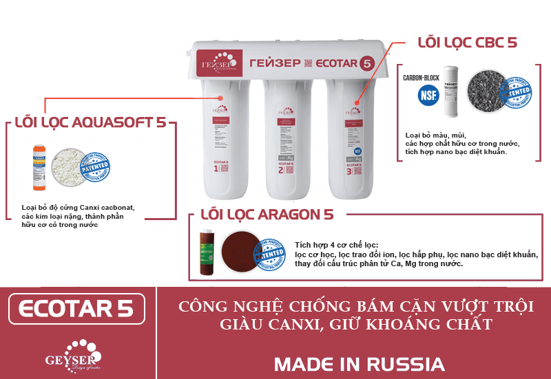 Ecotar 5 sử dụng vật liệu CBC 5 và vật liệu Aragon 5 của Geyser LB Nga tác dụng loại bỏ các rong rêu, tảo, nấm, gỉ sét từ đường ống; loại bỏ kim loại nặng, chất độc hại, chất hóa học, thuốc trừ sâu, chất phóng xạ tồn dư trong nước, loại bỏ màu, mùi.. giúp làm sạch nước hiệu quả.